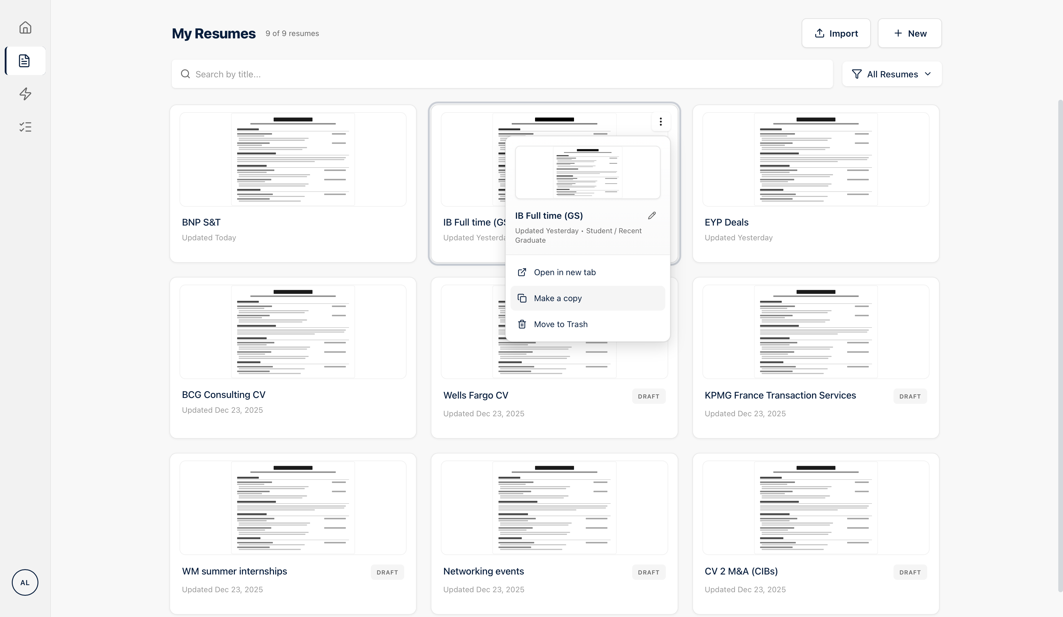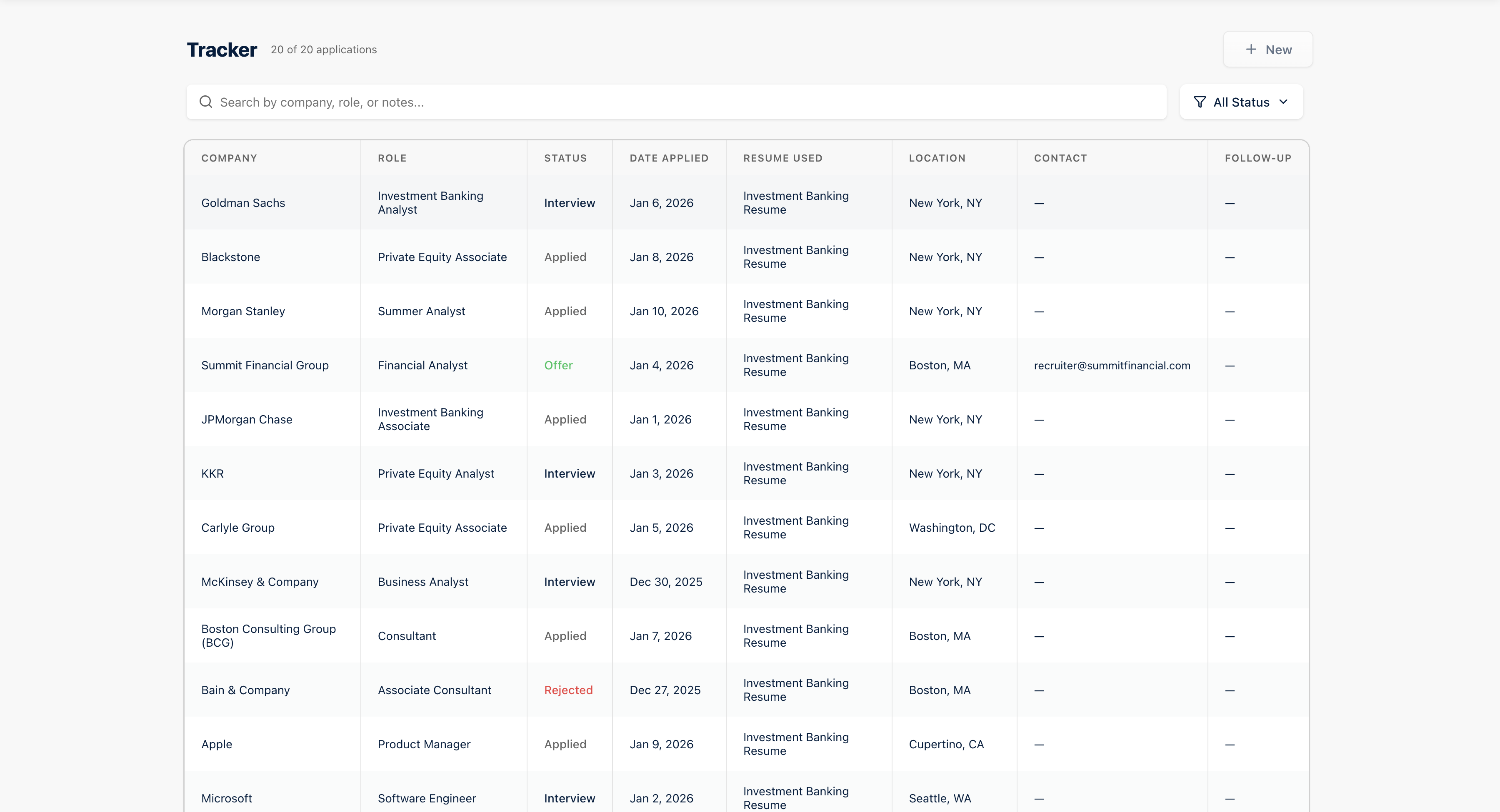ResumeStreet lets finance and consulting candidates use an AI agent to build role-specific resumes, Track and manage job applications by firm. AI-driven by default. Fully editable when needed.